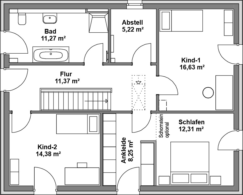Grundrisse, Visualisierungen und Illustrationen dienen der Veranschaulichung, sind nicht maßstabsgetreu und können optionale Sonderausstattungen zeigen. Ausschlaggebend ist die individuelle Planung mit dem Generalübernehmer.