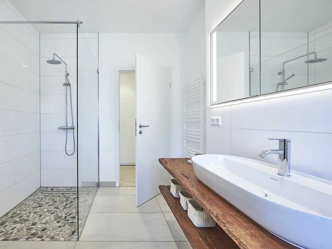 - Hochwertiges Fliesenpaket (Badezimmer, Gäste-WC, Diele, Flure, Küche) und Markensanitärobjekte.
