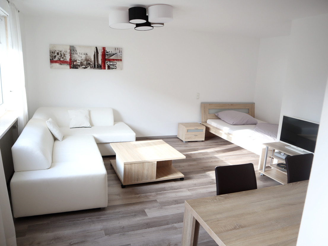 Die Wohnung ist aufgeteilt in einen Wohn-/Schlafbereich, Küche, Bad, Diele und Bad. Die Küche und das Bad sind mit Fliesen, Flur und Wohn-/Schlafbereich mit Laminat ausgestattet.